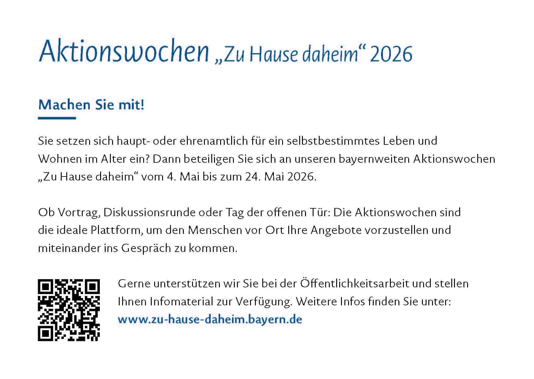 Die allermeisten Menschen haben einen Wunsch: Sie wollen möglichst lange möglichst selbstbestimmt und unabhängig wohnen – an dem Ort, der ihr Zuhause ist. In den Aktionswochen „Zu Hause daheim“, die das Bayerische Staatsministerium für Familie, Arbeit und Soziales all zwei Jahre veranstaltet, wird gezeigt, wie dieser Wunsch in Erfüllung gehen kann.